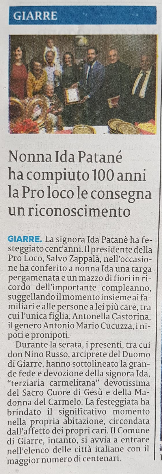 2019-11-27 - La Sicilia - Nonna Ida ha compiuto 100 anni - La Pro Loco le consegna un riconoscimento.jpg